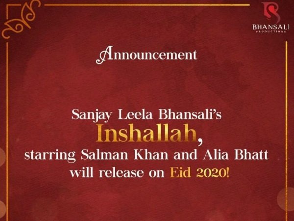 1999 میں سنجے لیلا بھنسالی کی ہدایت کاری میں بننے والی سلمان خان کی فلم ’’ہم دل دے چکے صنم‘‘ کے بعد دونوں ایک بار پھر کئی عرصے بعد فلم ’’انشاء اللہ‘‘ میں ایک ساتھ یکجا ہورہے ہیں جو 2020 میں عیدالفطر کے موقع پر ریلیز کی جائے گی لیکن ساتھ ہی اکشے کمار کی ایکشن سے بھرپور فلم ’’سوریا ونشی‘‘ کو بھی عید پر ہی ریلیز ہونا تھا تاہم بالی ووڈ کے سلطان کی وجہ سے اکشے کمار کی فلم عید سے قبل ریلیز کی جائے گی۔