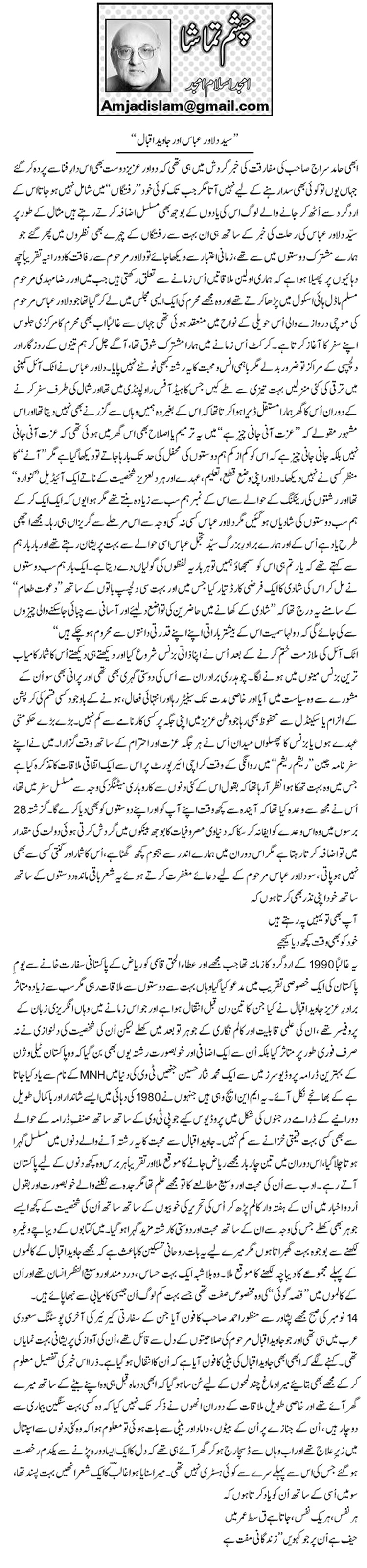اردو کالمزAmjad Islam Amjad سید دلاور عباس اور جاوید اقبال بواسطة Niaz Shakir - Monday, 18 November, 2019 0 951 FacebookTwitterPinterestWhatsApp
