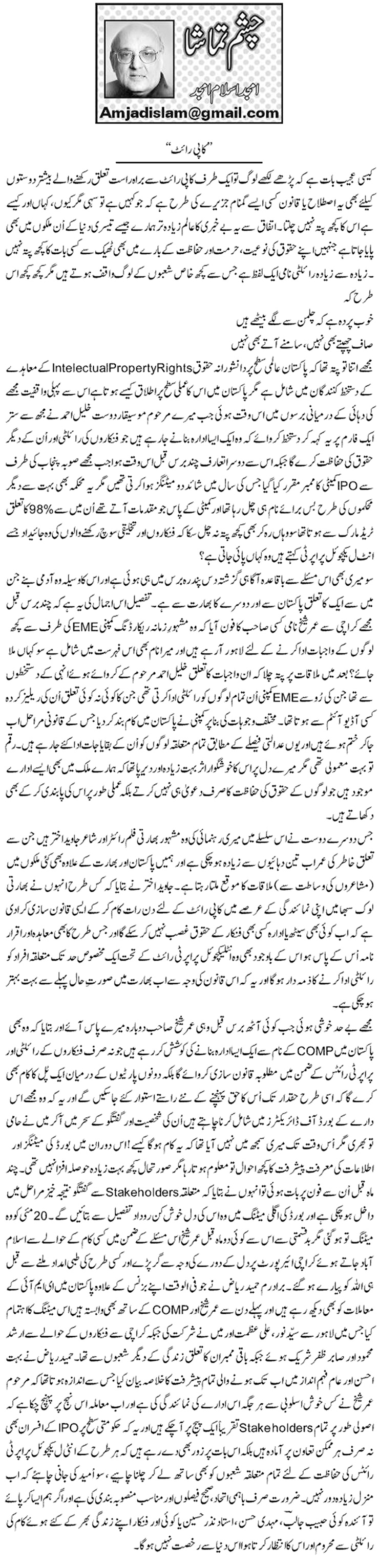 اردو کالمزAmjad Islam Amjad Amjad Islam Amjad coloumn on “Copyright” بواسطة Niaz Shakir - Monday, 3 June, 2019 0 533 FacebookTwitterPinterestWhatsApp